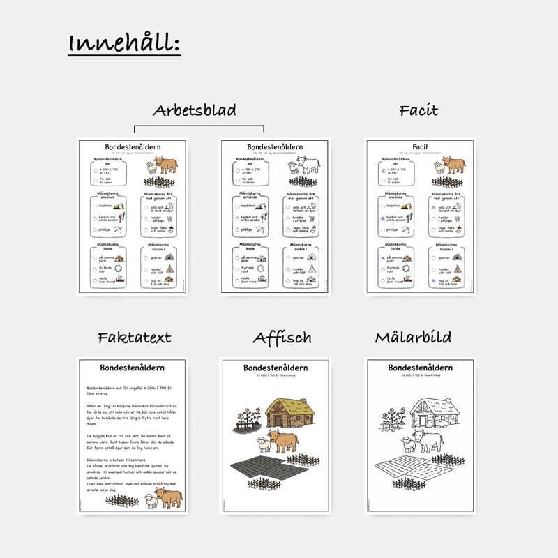 Ett lättillgängligt material om bondestenåldern som hjälper barn att förstå hur människor levde förr. Texten är enkel och tydlig, med stöd av bilder som gör innehållet lätt att ta till sig.