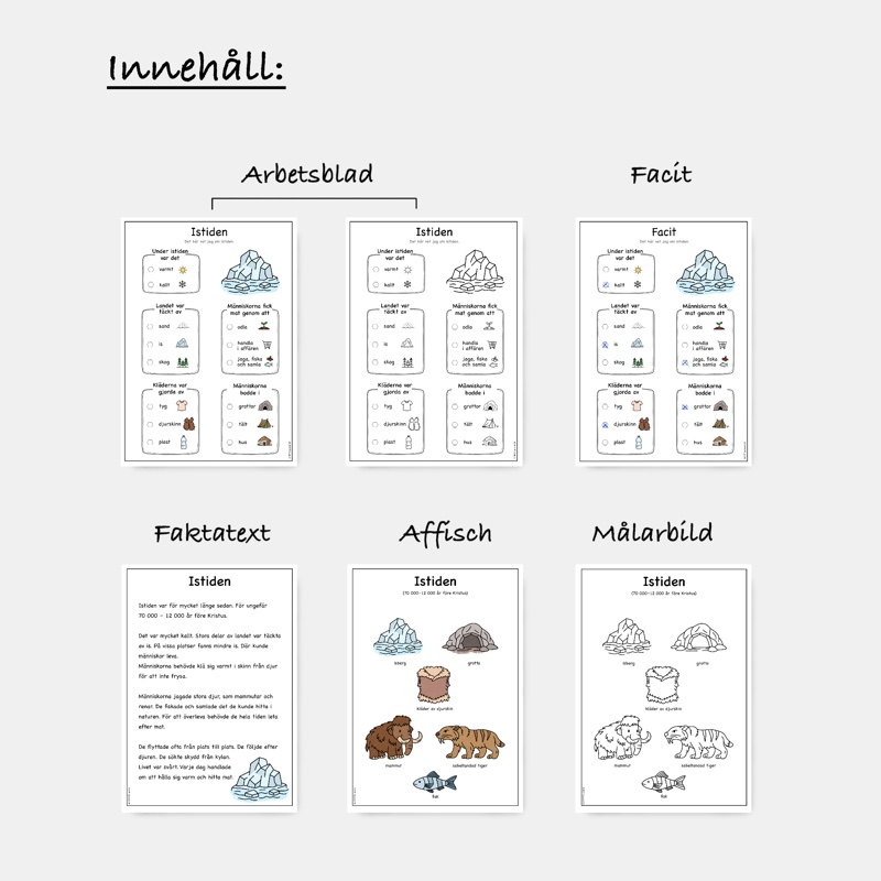 Ett lättillgängligt material om istiden som hjälper barn att förstå hur människor levde förr. Texten är enkel och tydlig, med stöd av bilder som gör innehållet lätt att ta till sig.