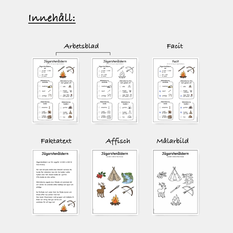 Ett lättillgängligt material om jägarstenåldern som hjälper barn att förstå hur människor levde förr. Texten är enkel och tydlig, med stöd av bilder som gör innehållet lätt att ta till sig.