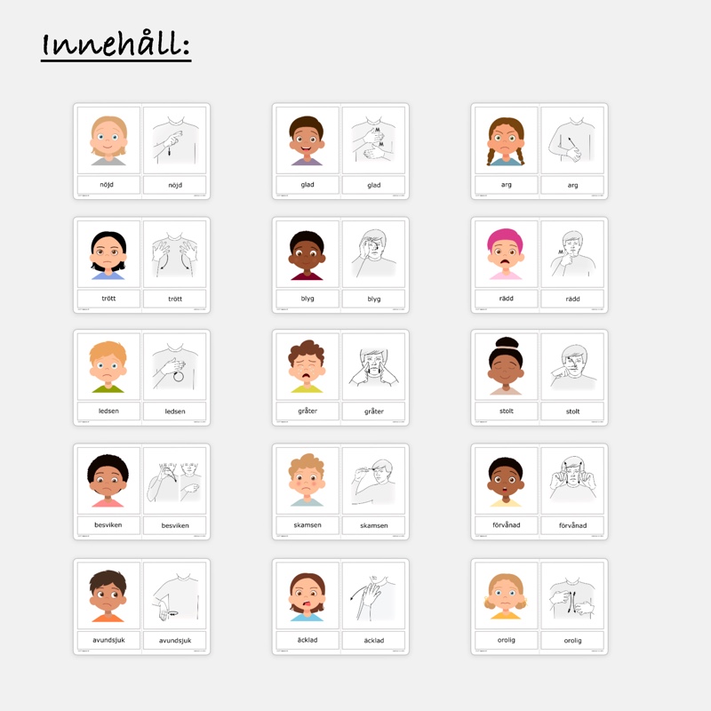 Hjälp barnen sätta ord på sina känslor och ger stöd i att prata om hur man mår. Med tydliga illustrationer och kompletterande TAKK-tecken blir det ett inkluderande verktyg som gör språket mer tillgängligt för alla.