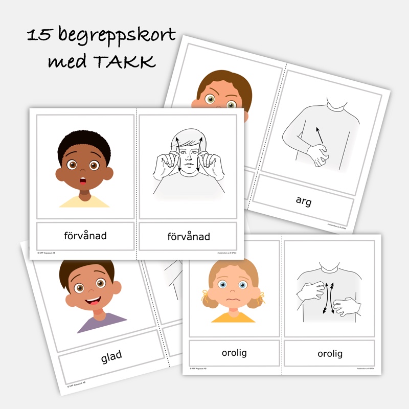 Varje känsla visas både med ansiktsuttryck och med TAKK-tecken