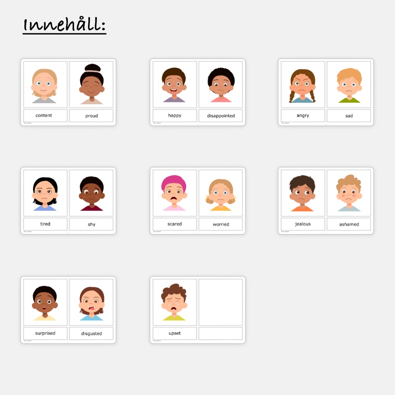 15 tydliga begreppskort som hjälper barnen att lära sig känslornas namn på engelska.