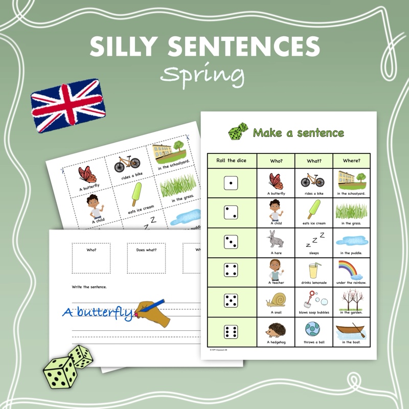 Anpassning: Klipp ut bilderna från det medföljande bladet. Barnen kan klistra dessa på sina arbetsblad och sedan skriva sina tokiga meningar. Detta hjälper till att förtydliga uppgiften.