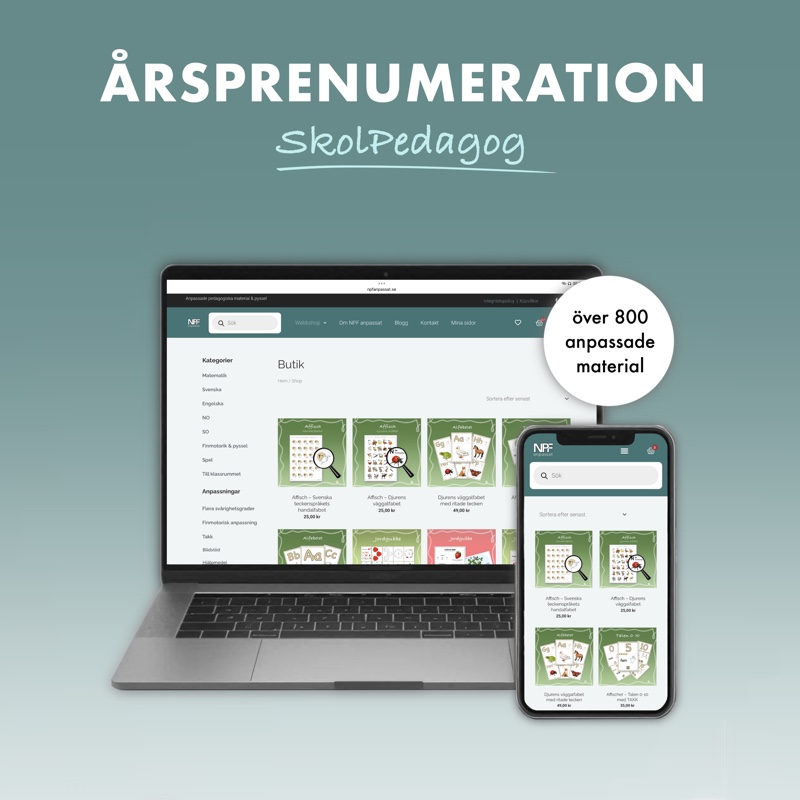 Med denna årsprenumeration får ni tillgång till över 800 pedagogiska material, anpassade efter olika behov och svårighetsgrader – med bildstöd, TAKK och finmotoriska anpassningar.