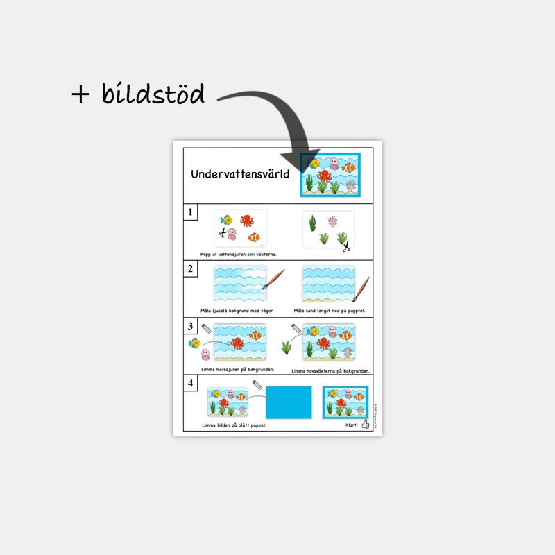 Barnen klipper ut havsdjur och växter, målar en vågig bakgrund och bygger steg för steg upp en undervattensmiljö med hjälp av tydligt bildstöd.